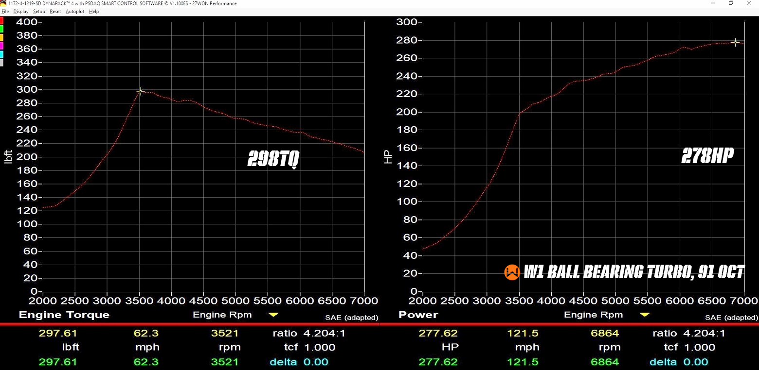 Showing a true drop-in comparison (Journal Bearing option shown here), we see an un-tuned power increase of +18wHP and wTQ carrying strong to redline. Following this, a tune optimized for the W1 Turbo nets a total of +42wHP.