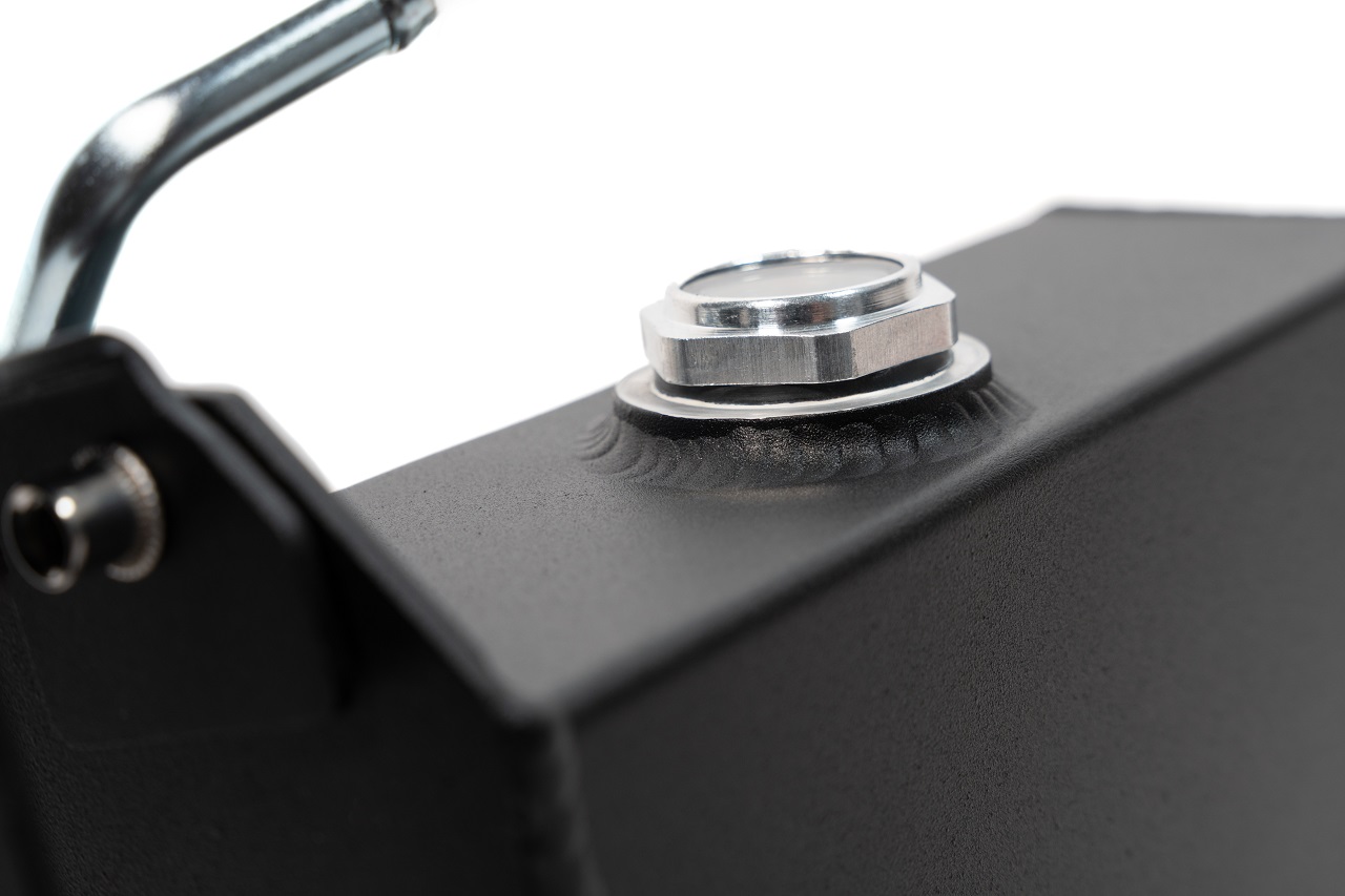 Now, this isn’t our first Coolant Tank, but it is the first one that uses a traditional sight glass. They’re convenient when it comes to checking and topping off your coolant levels. Just fill your Coolant Tank up to between the very bottom and the middle of the sight glass and you are ready to roll with just the right amount of fluid.